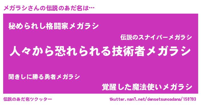 | ヒーロー風カッコイイあだ名 | 『正義の使者メガラシ』『仮面メガダー』 |
