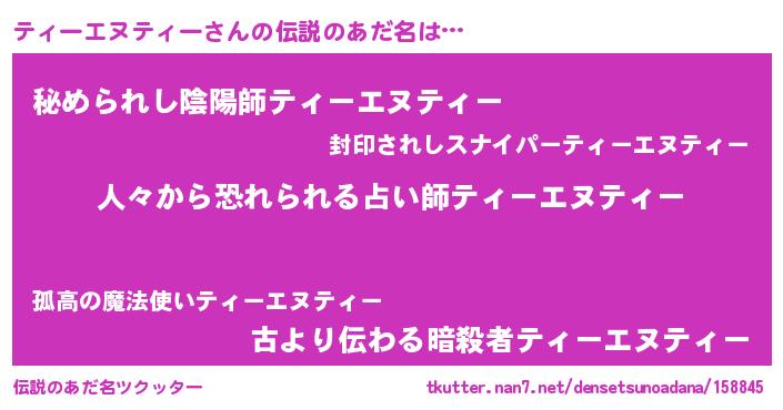 | 男性向けラノベタイトル風あだ名 | 『おまえをオタクにしてやるから、俺をティーエヌティーにしてくれ! 』 |