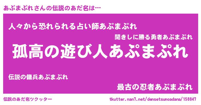| ヒーロー風カッコイイあだ名 | 『仮面アプダー』『幻影騎士アプ』 |