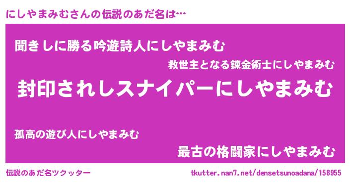| ヘコむあだ名 | 『にしっふぃ~』『にしやまみむ(小並感)』 |