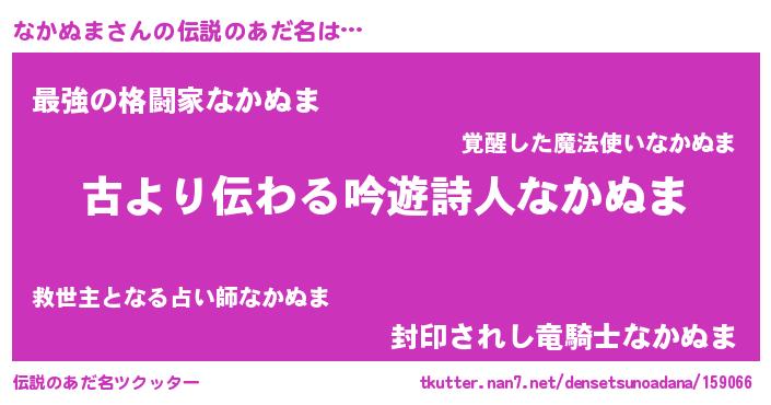 | 男性向けラノベタイトル風あだ名 | 『誰もが恐れるあのなかぬまが、ぼくの専属メイドになるようです。』 |