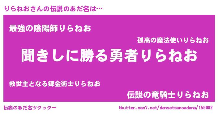 | 意味不明あだ名 | 『住所不定無職りらねお(89歳)』 |