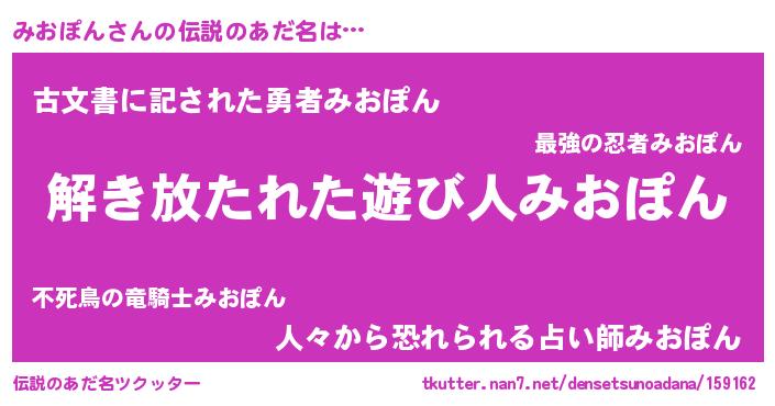 | 女子向けラノベタイトル風あだ名 | 『みおぽんの卵を拾いまして』 |