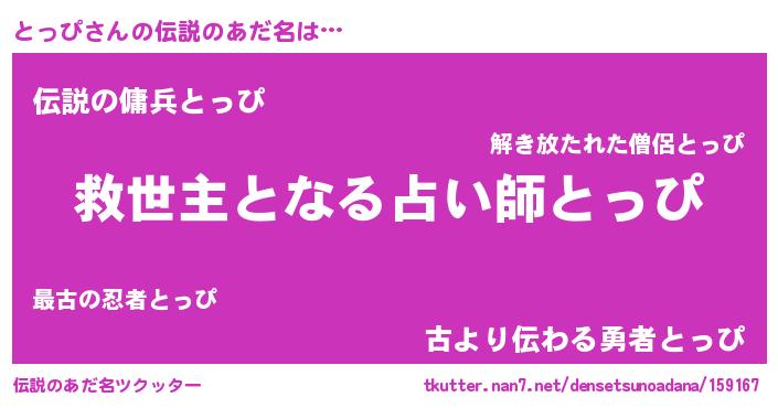 | ヒーロー風カッコイイあだ名 | 『慈愛の使者とっぴ』『スーパートッピ』 |