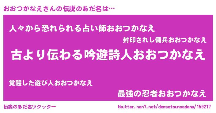 | 男性向けラノベタイトル風あだ名 | 『転生したらおおつかなえだった件』 |