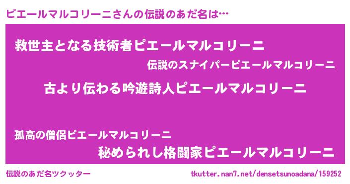 | ヘコむあだ名 | 『ピエールマルコリーニ(小並感)』『ピエを』 |