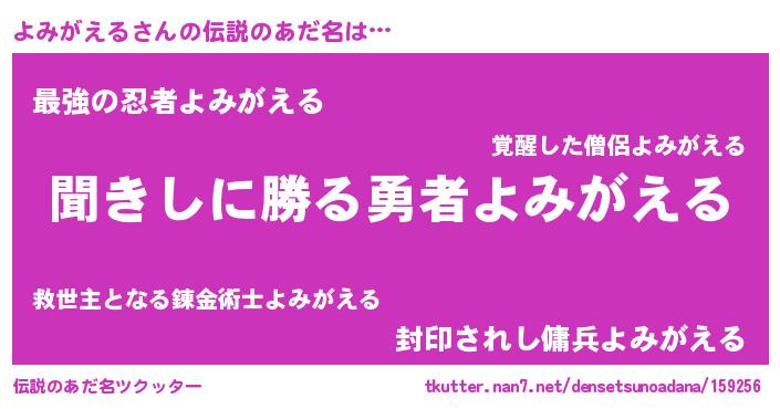 | 胡散臭い通販商品みたいなあだ名 | 『絶対に幸福をもたらす水素水…その名も「よみがえる」』 |