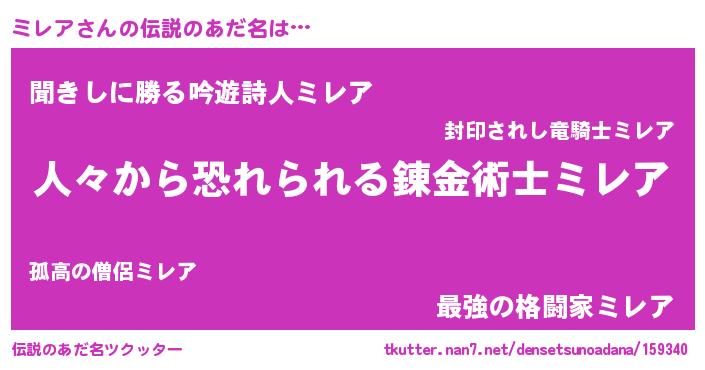 | 男性向けラノベタイトル風あだ名 | 『ミレアスレイヤー』 |