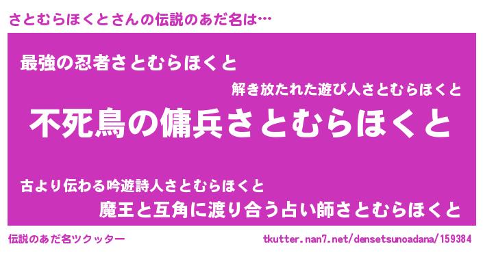 | 男性向けラノベタイトル風あだ名 | 『魔弾の王とさとむらほくと』 |