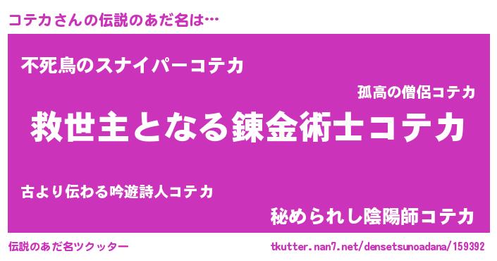 | 女子向けラノベタイトル風あだ名 | 『死神コテカの再婚』『闇のコテカ』 |