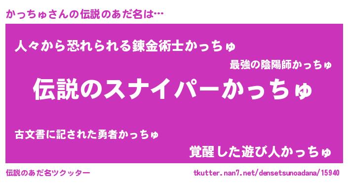 | 男性向けラノベタイトル風あだ名 | 『かっちゅの憂鬱』『魔弾の王とかっちゅ』 |