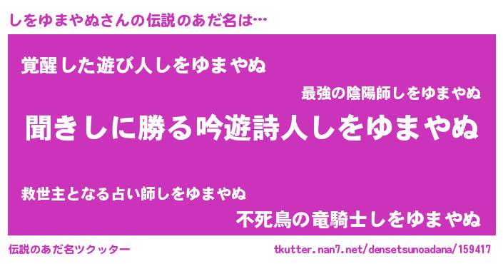 | 男性向けラノベタイトル風あだ名 | 『しをゆまやぬという概念が存在しない退屈な世界 』 |