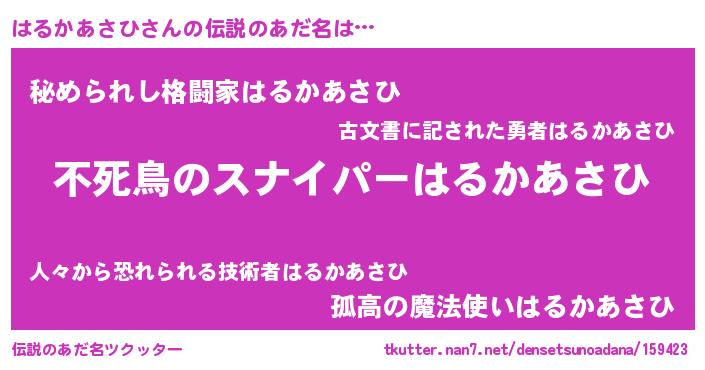 | 男性向けラノベタイトル風あだ名 | 『はるかあさひの憂鬱』 |