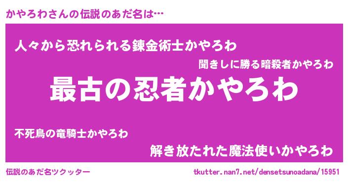 | 女子向けラノベタイトル風あだ名 | 『かやろわ伯爵の花嫁』『かやろわ恋絵巻』 |