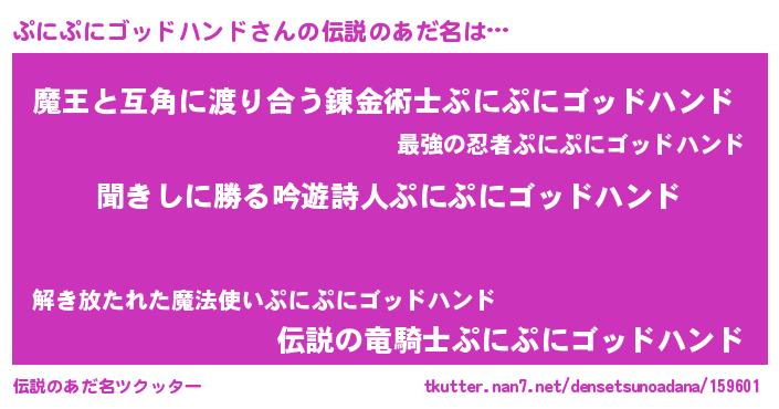 | 男性向けラノベタイトル風あだ名 | 『魔弾の王とぷにぷにゴッドハンド』 |