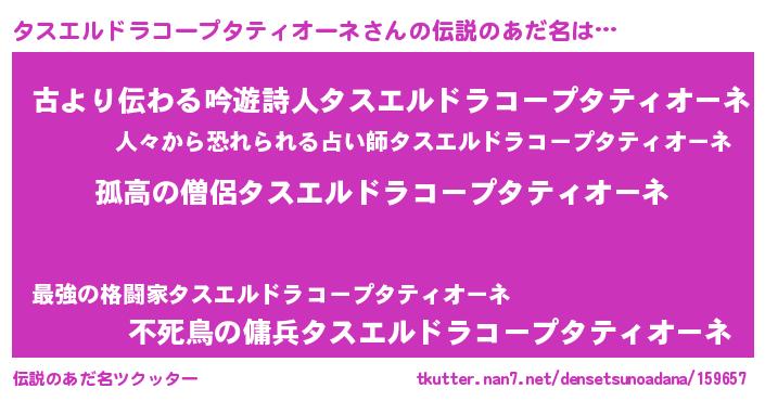 | 意味不明あだ名 | 『とにかく怪しいタスエルドラコープタティオーネ』 |