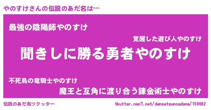 | 男性向けラノベタイトル風あだ名 | 『やのすけという概念が存在しない退屈な世界 』 |