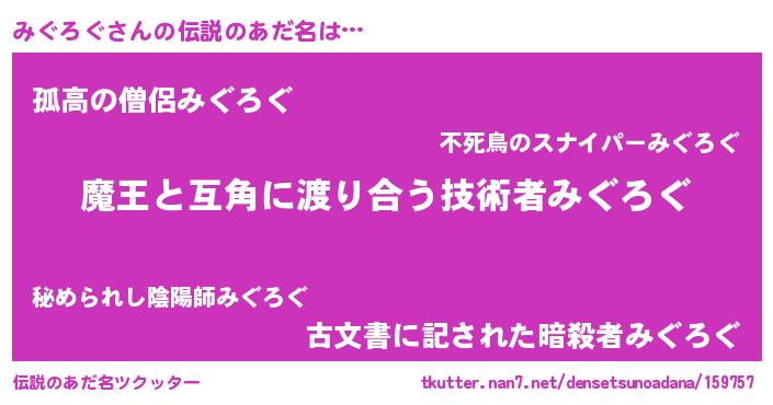 | ヒーロー風カッコイイあだ名 | 『仮面ミグダー』『愛の使者みぐろぐ』 |
