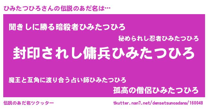 | 男性向けラノベタイトル風あだ名 | 『ひみたつひろに滅ぼされるだけの簡単なお仕事です』 |