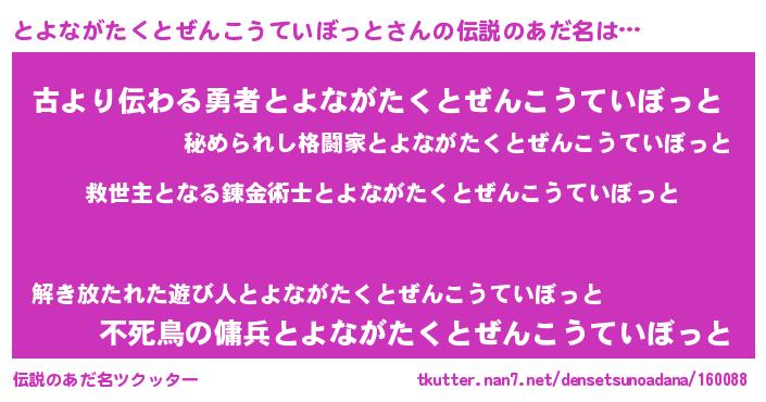 | ヒーロー風カッコイイあだ名 | 『慈愛の使者とよながたくとぜんこうていぼっと』 |