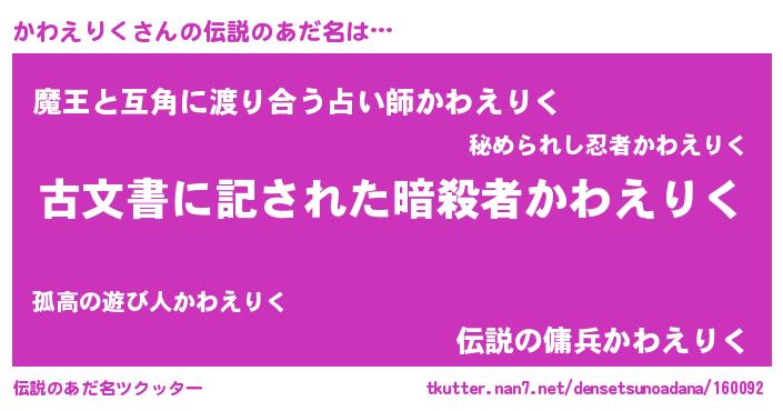| 男性向けラノベタイトル風あだ名 | 『かわえりくに滅ぼされるだけの簡単なお仕事です』 |