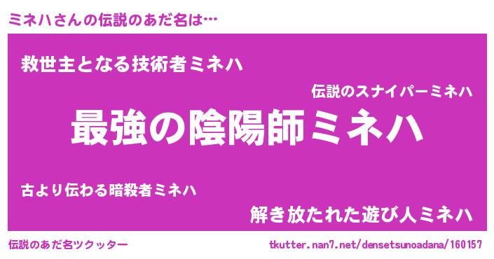 | 意味不明あだ名 | 『住所不定無職ミネハ(93歳)』『自称ミネハ』 |