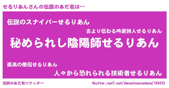 | 意味不明あだ名 | 『住所不定無職せるりあん(85歳)』 |