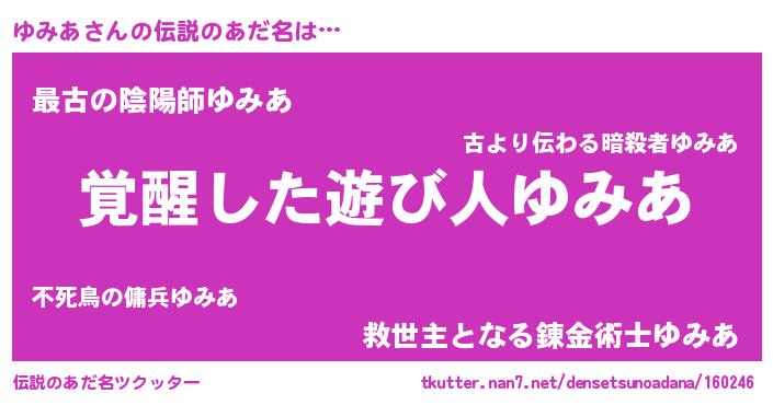 | 男性向けラノベタイトル風あだ名 | 『ゆみあ~年齢イコール彼女いない歴の魔法使い~』 |