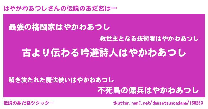 | ヘコむあだ名 | 『はやかわあつし(小並感)』『酢こんぶ』 |