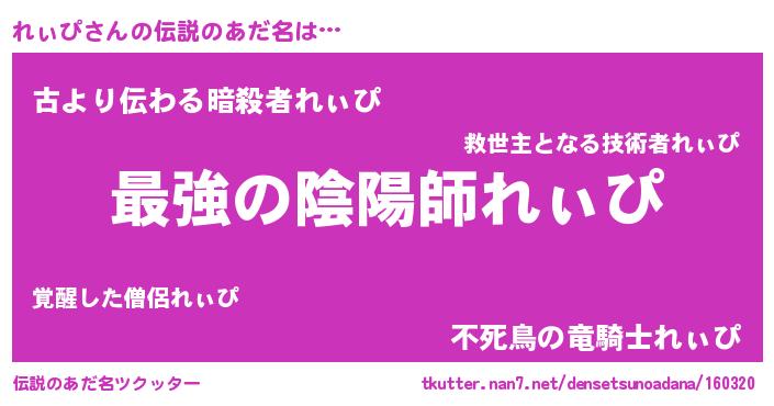| ヒーロー風カッコイイあだ名 | 『ウルトラれぃぴマン』『ネオレィピ』 |