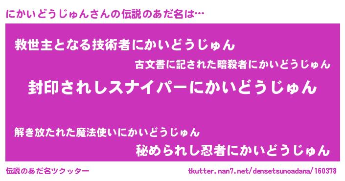 | 男性向けラノベタイトル風あだ名 | 『ニカイドウジュンアートオンライン』 |