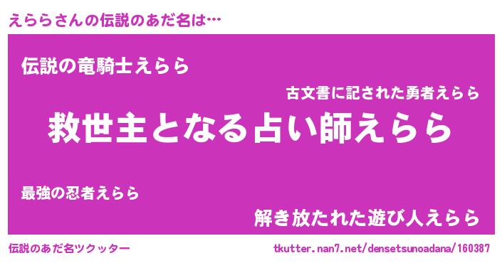 | 女子向けラノベタイトル風あだ名 | 『えららの玉の輿計画!』『闇のえらら』 |