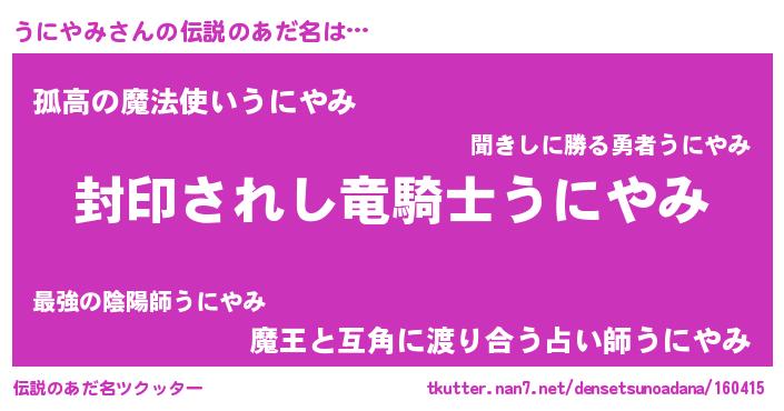 | 意味不明あだ名 | 『住所不定無職うにやみ(1歳)』 |