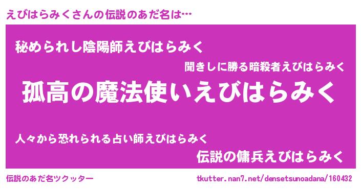 | 胡散臭い通販商品みたいなあだ名 | 『信頼と実績のサプリメント…その名も「えびはらみく」』 |