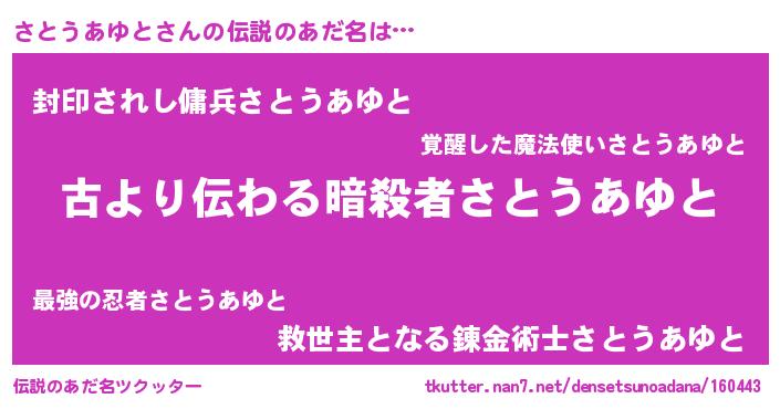 | ヒーロー風カッコイイあだ名 | 『仮面サトダー』『ネオサトウアユト』 |