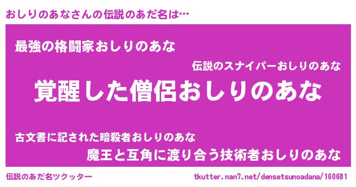 | 男性向けラノベタイトル風あだ名 | 『おしりのあな~年齢イコール彼女いない歴の魔法使い~』 |