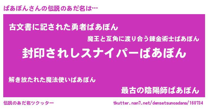 | 男性向けラノベタイトル風あだ名 | 『ばあぼん~年齢イコール彼女いない歴の魔法使い~』 |