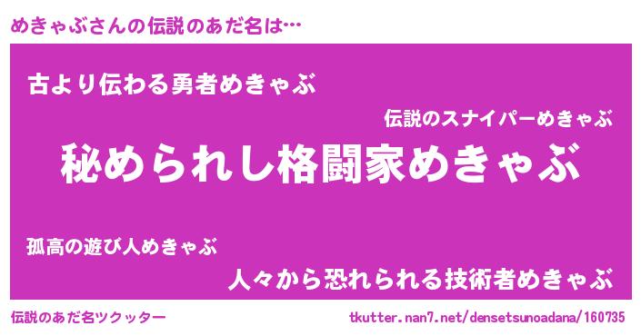 | ヒーロー風カッコイイあだ名 | 『ウルトラめきゃぶマン』『ネオメキャブ』 |