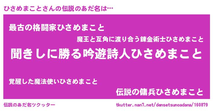 | 女子向けラノベタイトル風あだ名 | 『異世界で失敗しない100のひさめまこと』 |
