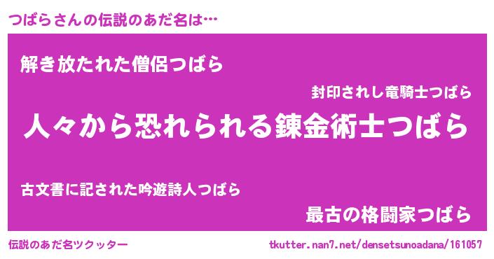 | 男性向けラノベタイトル風あだ名 | 『ツバラスレイヤー』『緋弾のツバラ』 |