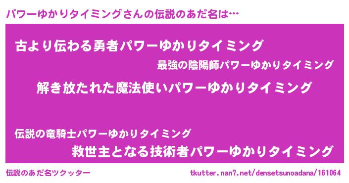 | 男性向けラノベタイトル風あだ名 | 『パワーゆかりタイミングの嫁は女の子じゃないと思った?』 |