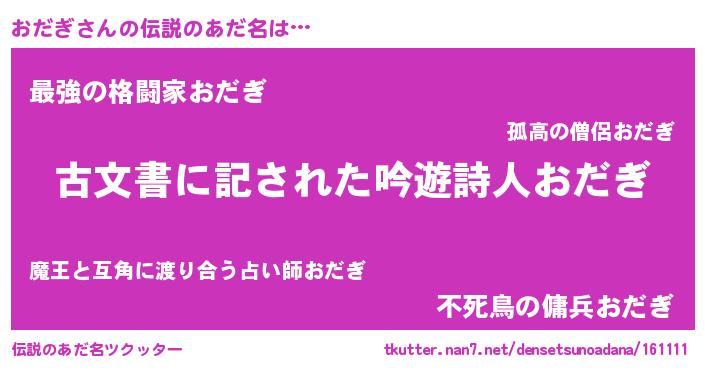 | 胡散臭い通販商品みたいなあだ名 | 『あなたにだけ特別に提供する100年もののヴィンテージワイン…その名も「おだぎ」』 |