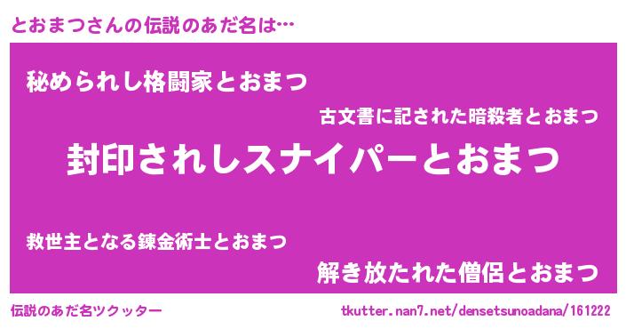 | 胡散臭い通販商品みたいなあだ名 | 『億万長者になれる霊験あらたかなお札…その名も「とおまつ」』 |