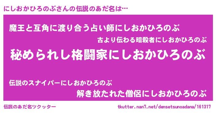 | ファンタジー風あだ名 | 『エターナルニシオカヒロノブー』 |
