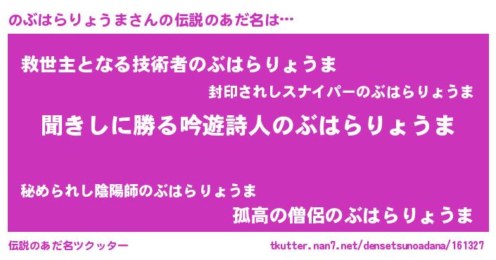 | 男性向けラノベタイトル風あだ名 | 『のぶはらりょうまという概念が存在しない退屈な世界 』 |