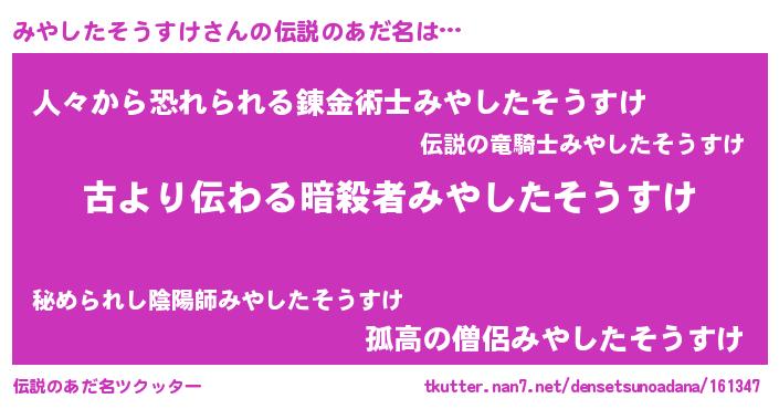 | ヒーロー風カッコイイあだ名 | 『仮面ミヤダー』『ネオミヤシタソウスケ』 |