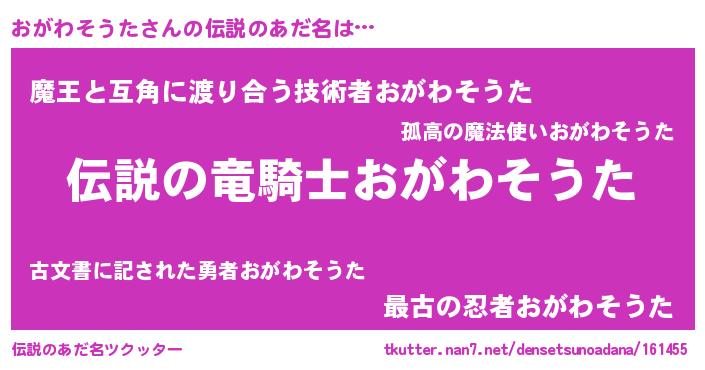 | 男性向けラノベタイトル風あだ名 | 『魔弾の王とおがわそうた』 |