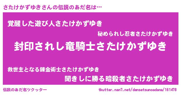 | 男性向けラノベタイトル風あだ名 | 『うちのさたけかずゆきが世界を掌握している!』 |