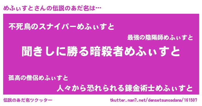 | 男性向けラノベタイトル風あだ名 | 『緋弾のメフィスト』『めふぃすとの憂鬱』 |