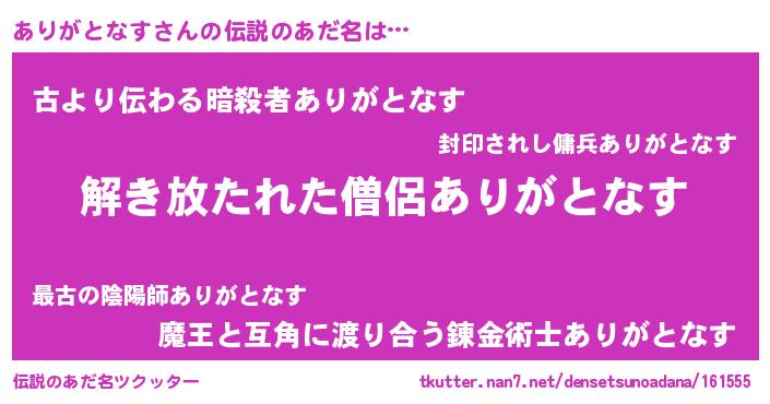 | 男性向けラノベタイトル風あだ名 | 『ありがとなすの嫁は女の子じゃないと思った?』 |